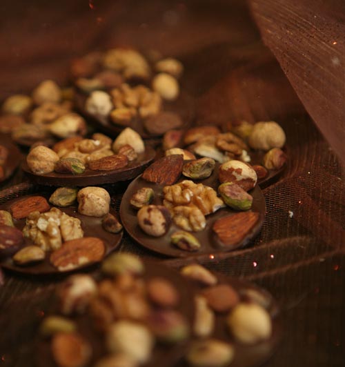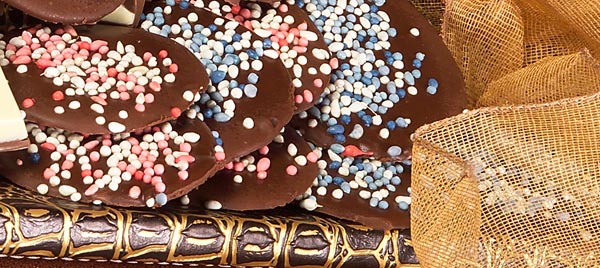 شوكولا بشكل شرائح البطاطا الرقيقة تقدم في جميع المناسبات والحفلات. سادة أو بالمكسرات وملاعق الشوكولا التي يمكن تقديمها مع مشروب الشوكولا الساخن أو مع المثلجات.